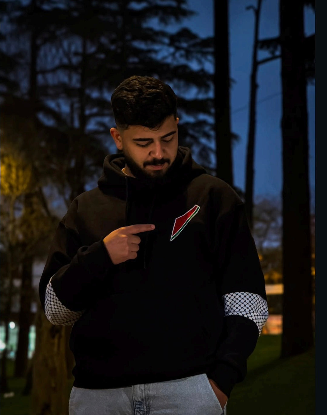 This hoodie merges streetwear style with Palestinian symbolism. The subtle chest emblem and keffiyeh sleeve design represent culture, strength, and belonging.